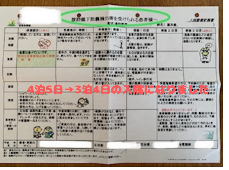 基本は腹腔鏡手術ですが、万が一の場合は開腹手術になると説明がありました。その場合は入院が長引きます。